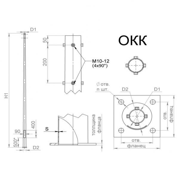 Опора ОКК изготавливается из листа стали и её ствол сужается от основания к вершине, что придаёт изделию максимальную устойчивость. Ствол конструкции полый, что снижает её вес и даёт возможность протягивать питающий кабель к осветительным приборам .